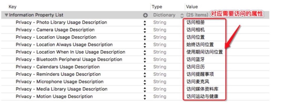 在使用攝像頭、麥克風、定位、相冊等功能的時候,會檢查相應權限。用戶需要手動在項目的info.plist文件中添加相應權限,如下圖所示: