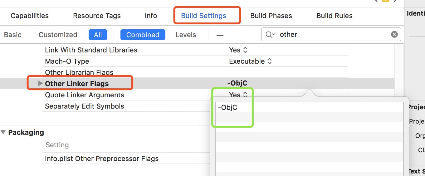 在Xcode中,添加如下編譯設置:Other Link Flags : -ObjC,設置